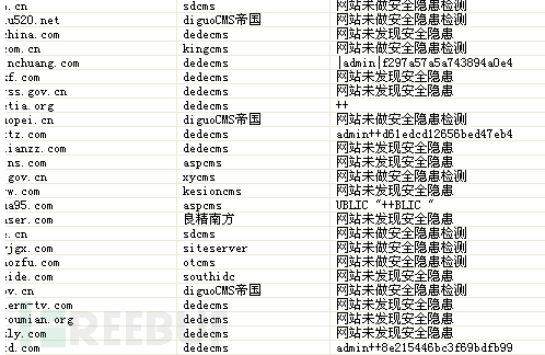 通过对30个网站样本进行扫描,发现3个弱口令。其中第一个是admin|f297a57a5a743894a0e4。7a57a5a743894a0e,百度一下就知道是admin的CMD5值。也就是说第一个网站他的管理员账号密码和用户名是一致的。密码的设置一定要避免和一些可能无需登录就能暴露出来的信息有关。笔者建议密码千万不要和用户名、网站名或域名有任何关系,这些都是极容易被别人猜出来的。