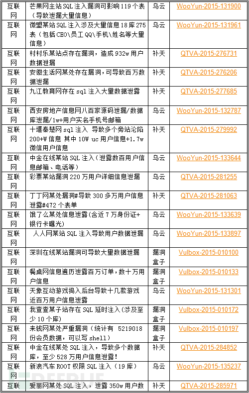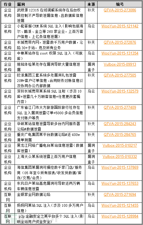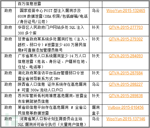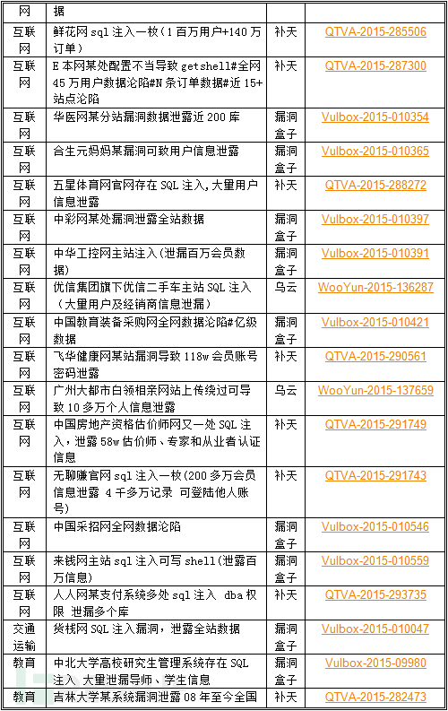 2015年8月,我们总结发布了102个数据泄密高危漏洞,这些漏洞分别来自漏洞盒子、乌云、补天等平台,涉及11个行业,企业机构、互联网、交通运输、教育、金融保险、旅游、能源、社保公积金、医疗卫生、运营商、政府。102个漏洞中,其中绝大多数泄露威胁是由SQL注入和弱口令引起的。