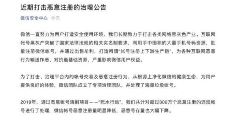 同时,微信团队称,对各类违法违规行为一直坚决处理,绝不姑息。恶意注册给网络欺诈、恶意薅羊毛、网络色情、网络赌博、垃圾营销等违法违规行为提供了作恶最基本的帐号资源,更是我们明确打击的对象。
