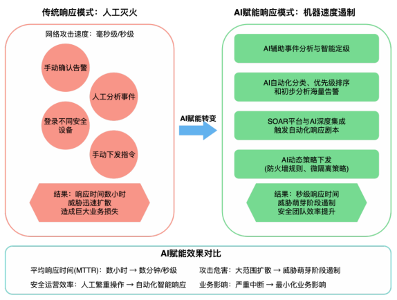 AI赋能行为异常检测 AI可以赋能行为异常检测能力。具体功能包括一是动态行为基线学习,AI(如UEBA、NTA、高级EDR)持续学习用户、系统、网络、应用的日常行为模式,自动建立独特的正常行为基线。二是具备实时异常识别能力,不断将当前行为与学习到的基线进行对比,一旦发现显著偏离,即便行为本身在技术上合法,AI也能将其标记为异常。三是进行良/恶意行为区分,根据上下文和关联分析,区分是良性异常(如员工首次出差登录)还是真正的恶意行为(如恶意数据窃取)。 AI赋能行为异常检测使企业发现传统方法无法识别的隐形威胁,例如零日漏洞利用、未被发现的内部威胁或高级持续性威胁(APT)中伪装成正常操作的隐蔽步骤。通过实时告警和情境化的分析,企业能够将威胁发现的范围扩大,显著降低内部威胁或长期潜伏攻击造成的损失,提高整体威胁感知能力。 场景三:智能决策与自动化响应 - 实现秒级遏制网络攻击的速度极快(毫秒级/秒级),传统的安全响应流程通常依赖人工判断和手动操作,往往无法有效跟进。例如包括确认告警、分析事件、登录不同安全设备下发指令。这种人工灭火模式导致响应速度严重滞后于攻击速度,极易错失最佳遏制时机,造成威胁迅速扩散和巨大业务损失。
