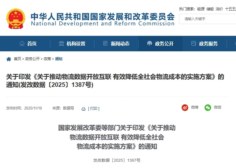 国家发改委印发《关于推动物流数据开放互联 有效降低全社会物流成本的实施方案》