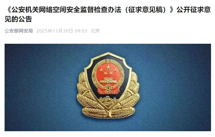 公安部近日发布《公安机关网络空间安全监督检查办法(征求意见稿)》,拟取代2018年旧规。新规依据《数据安全法》与《个人信息保护法》,将监管对象大幅扩展至数据处理者及个人信息处理者,明确网络空间安全涵盖网络、信息及数据三重维度。