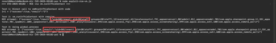 攻击脚本成功返回命令执行结果,证实远程代码执行(RCE)漏洞真实存在。