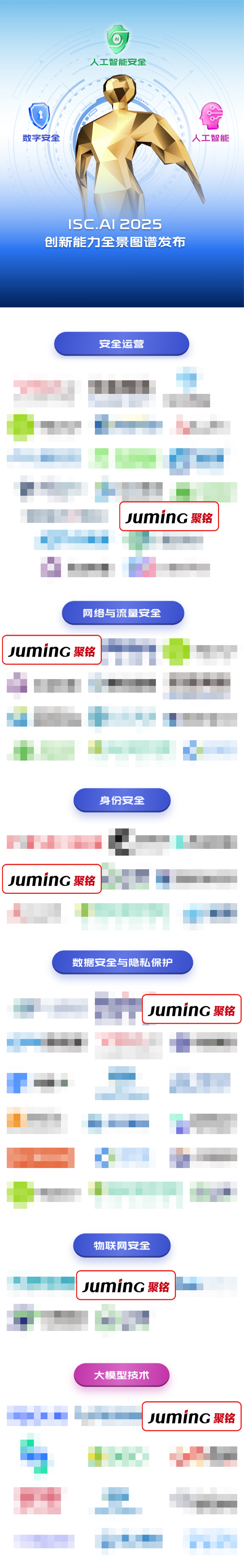 近日,《ISC.AI 2025创新能力全景图谱》正式发布。聚铭网络在安全运营、网络与流量安全、身份安全、数据安全与隐私保护、物联网安全以及大模型技术6大核心赛道同步上榜,多维度展现了其在信息安全领域的综合服务能力与技术创新成果。