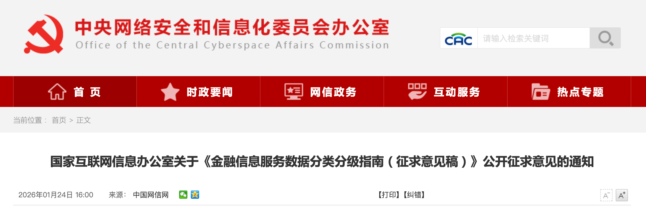国家互联网信息办公室关于《金融信息服务数据分类分级指南(征求意见稿)》公开征求意见的通知
