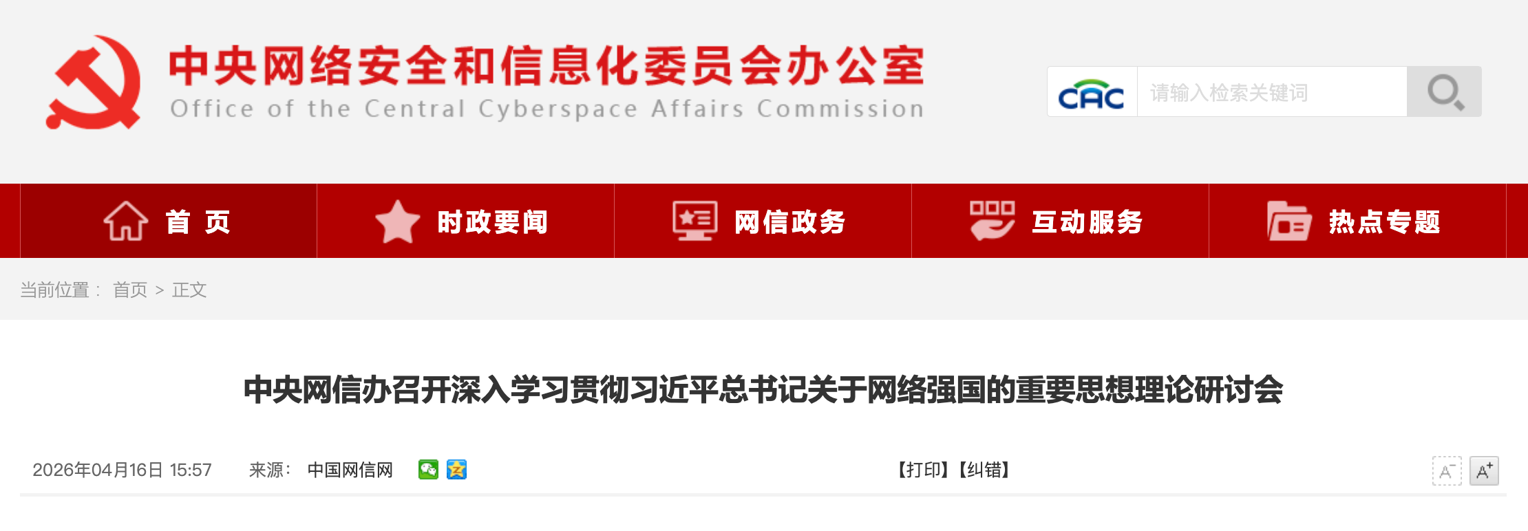 2016年4月19日,习近平总书记主持召开网络安全和信息化工作座谈会并发表重要讲话,在全社会引发热烈反响,为做好网络安全和信息化工作指明了前进方向、提供了重要遵循。为深入学习贯彻习近平总书记关于网络强国的重要思想,把学习贯彻习近平总书记在网络安全和信息化工作座谈会上的重要讲话精神持续引向深入,4月16日,中央网信办召开深入学习贯彻习近平总书记关于网络强国的重要思想理论研讨会,交流学习体会,深化理论研讨,进一步凝聚加快建设网络强国的广泛共识和强大合力,为实现“十五五”良好开局,全面推进强国建设、民族复兴伟业作出新的贡献。中央宣传部副部长、中央网信办主任、国家网信办主任庄荣文出席会议并讲话,中央党史和文献研究院院长曲青山作书面交流,教育部党组书记、部长怀进鹏,科学技术部党组成员、科技日报社社长吴兢出席会议并讲话。中央网信办副主任、国家网信办副主任牛一兵主持会议。中央网信办副主任、国家网信办副主任王京涛、李长喜,中央党史和文献研究院副院长、机关党委书记孙东升出席会议。